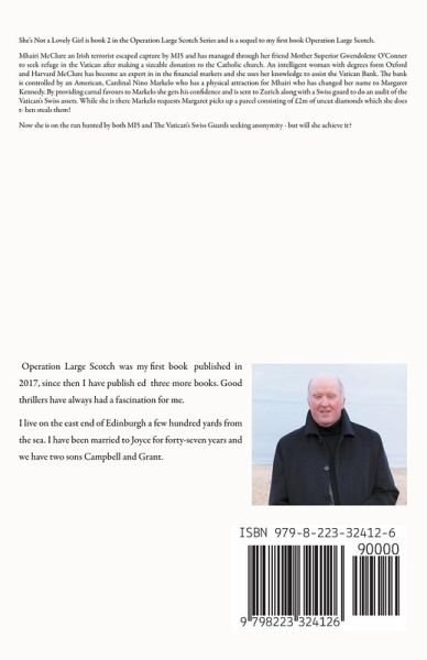 She's Not a Lovely Girl is book 2 in the Operation Large Scotch Series and is a sequel to my first book Operation Large Scotch. Mhairi McClure an Irish terrorist escaped capture by MI5 and has managed through her friend Mother Superior Gwendolene O'Conner to seek refuge in the Vatican after making a sizeable donation to the Catholic church. An intelligent woman with degrees form Oxford and Harvard McClure has become an expert in in the financial markets and she uses her knowledge to assist the Vatican Bank. The bank is controlled by an American, Cardinal Nino Markelo who has a physical attraction for Mhairi who has changed her name to Margaret Kennedy. By providing carnal favours to Markelo she gets his confidence and is sent to Zurich along with a Swiss guard to do an audit of the Vatican's Swiss assets. While she is there Markelo requests Margaret picks up a parcel consisting of £2m of uncut diamonds which she does t- hen steals them! Now she is on the run hunted by both MI5 and The Vatican's Swiss Guards seeking anonymity - but will she achieve it?