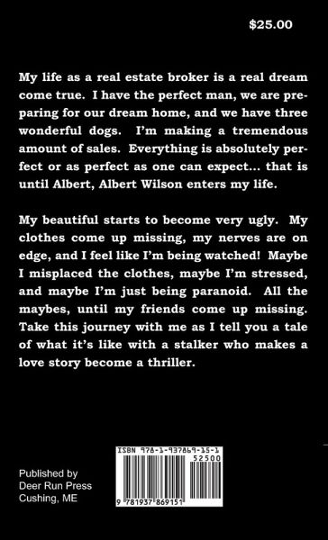 Caught in the bustle of everyday life, Cassie is unaware of an ominous presence in the shadows. Hunted like an animal, her every movement is being tracked. Follow Cassie, as she discovers things are seldom what they see, and nothing is ever guaranteed. I don't know how I ended up in this evil hell. It's dark, cold and scary. I fear for my life that I just want back to how it was before this monster entered into it. How can it go from perfectly planned to chaos and cruelty? As he walks dragging me behind him by my ponytail, I can feel my fingernails sink into some of the mud. Pulling, grasping at the dead grass as each finger passes a trail of its very own. I want to scream, but no words come out. I know nobody would hear me, anyway. I close my eyes remembering a better time. One full of warmth, love and laughter. Our parents surrounding our table as we enjoy a family meal in a wholesome environment. Sharing good news with one another and joking about one thing or another. That's the way it's supposed to be you know. It's not supposed to be like this. Where did I go wrong?! What happened to my cookie cutter lifestyle? I started noticing little things I should have paid more attention too, but whenever I would mention them to Jeremy he'd just blow it off and say I must have overlooked them. For example, like my clothes that went missing. It happened to many times. Another example is the dogs barking and looking into the woods. I should have realized the red flags and demanded more attention to them. Of course, there was that kiss. The one I should have never did. The one I never want to remember again. Maybe this is my fault. Was I leading him on? Who would have thought one mistake could end up a life sentence?! I guess death is my fate, and I should recognize it's the consequence to my action. No, no what am I thinking! I don't want to die. I try moving my legs a little, but to no avail. I feel stiff and heavy. I can hear him putting the shovel in the ground and digging up the dirt and mud in giant clunks. His breath is heavy as he mutters what I can't hear him say. I close my eyes again remembering a better time. I'm selling property which I consider dreams. I make peoples dreams come true by finding them homes they are happy within. I'm a simple woman, really. One who is going to be married then to make a family of our very own together. I'm happy with my soon to be husband. Happy with my life. Or was. Now I'm lying here like dead meat. Nobody to protect me. I don't feel like I can fend for myself. He stalked me like prey, found a time to attack me, and then brought me here. To the dark, cold, and scary woods. I can still hear him digging. I try to move my legs again. I try to wiggle my arms. There's still no movement. Life can't get any worse than this for me. Can it?