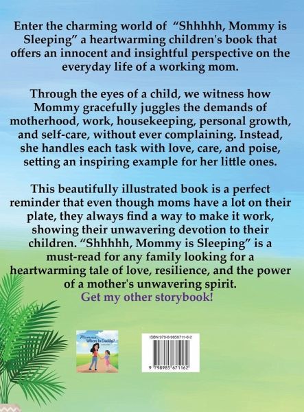 Enter the charming world of "Shhhhh, Mommy is Sleeping" a heartwarming children's book that offers an innocent and insightful perspective on the everyday life of a working mom. Through the eyes of a child, we witness how Mommy gracefully juggles the demands of motherhood, work, housekeeping, personal growth, and self-care, without ever complaining. Instead, she handles each task with love, care, and poise, setting an inspiring example for her little ones. This beautifully illustrated book is a perfect reminder that even though moms have a lot on their plate, they always find a way to make it work, showing their unwavering devotion to their children. "Shhhhh, Mommy is Sleeping" is a must-read for any family looking for a heartwarming tale of love, resilience, and the power of a mother's unwavering spirit.