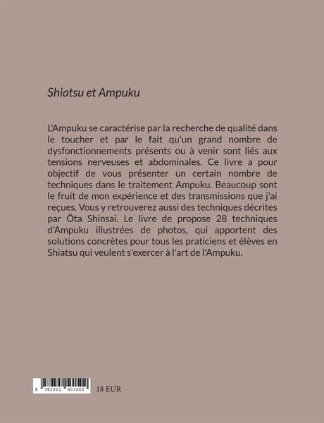 L'Ampuku se caractérise par la recherche de qualité dans le toucher et par le fait qu'un grand nombre de disfonctionnements présents ou à venir sont liés aux tensions nerveuses et abdominales. Ce livre a pour objectif de vous présenter un certain nombre de techniques dans le traitement Ampuku. Vous y retrouverez aussi des techniques décrites par Öta Shinsai. Le livre de 52 pages présente 28 techniques D'Ampuku illustrées de photos, qui apportent des solutions concrètes à tous ceux qui pratiquent le Shiatsu ou le massage.