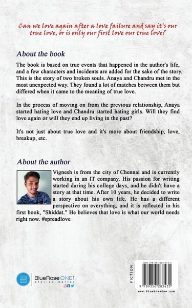 The book is based on true events that happened in the author's life, and a few characters and incidents are added for the sake of the story. This is the story of two broken souls. Anaya and Chandru met in the most unexpected way. They found a lot of matches between them but differed when it came to the meaning of true love. In the process of moving on from the previous relationship, Anaya started hating love and Chandru started hating girls. Will they find love again or will they end up living in the past? It's not just about true love and it's more about friendship, love, breakup, etc.