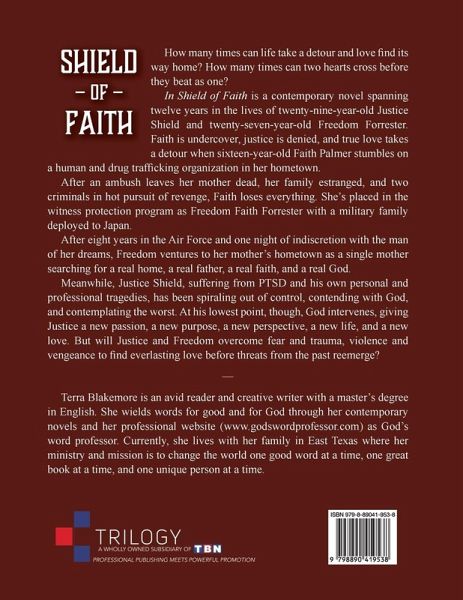 How many times can life take a detour and love find its way home? How many times can two hearts cross before they beat as one? In Shield of Faith is a contemporary novel spanning twelve years in the lives of twenty-nine-year-old Justice Shield and twenty-seven-year-old Freedom Forrester. Faith is undercover, justice is denied, and true love takes a detour when sixteen-year-old Faith Palmer stumbles on a human and drug trafficking organization in her hometown. After an ambush leaves her mother dead, her family estranged, and two criminals in hot pursuit of revenge, Faith loses everything. She's placed in the witness protection program as Freedom Faith Forrester with a military family deployed to Japan. After eight years in the Air Force and one night of indiscretion with the man of her dreams, Freedom ventures to her mother's hometown as a single mother searching for a real home, a real father, a real faith, and a real God. Meanwhile, Justice Shield, suffering from PTSD and his own personal and professional tragedies, has been spiraling out of control, contending with God, and contemplating the worst. At his lowest point, though, God intervenes, giving Justice a new passion, a new purpose, a new perspective, a new life, and a new love. But will Justice and Freedom overcome fear and trauma, violence and vengeance to find everlasting love before threats from the past reemerge?