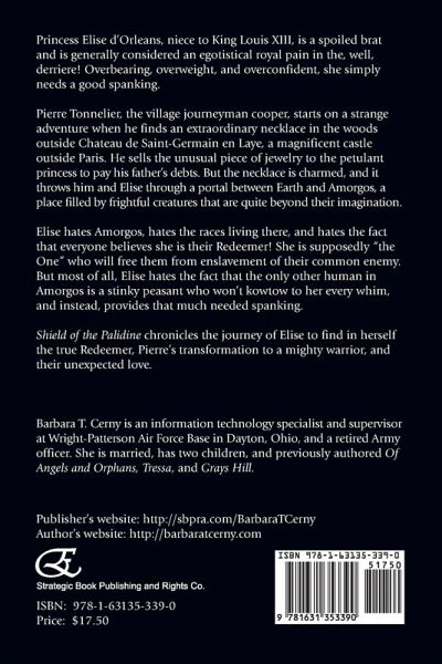 Princess Elise d'Orleans, niece to King Louis XIII, is a spoiled brat and is generally considered an egotistical royal pain in the, well, derriere! Overbearing, overweight, and overconfident, she simply needs a good spanking. Pierre Tonnelier, the village journeyman cooper, starts on a strange adventure when he finds an extraordinary necklace in the woods outside Chateau de Saint-Germain en Laye, a magnificent castle outside Paris. He sells the unusual piece of jewelry to the petulant princess to pay his father's debts. But the necklace is charmed, and it throws him and Elise through a portal between Earth and Amorgos, a place filled by frightful creatures that are quite beyond their imagination.Elise hates Amorgos, hates the races living there, and hates the fact that everyone believes she is their Redeemer! She is supposedly "the One" who will free them from enslavement of their common enemy. But most of all, Elise hates the fact that the only other human in Amorgos is a stinky peasant who won't kowtow to her every whim, and instead, provides that much needed spanking.Shield of the Palidine chronicles the journey of Elise to find in herself the true Redeemer, Pierre's transformation to a mighty warrior, and their unexpected love.Barbara T. Cerny is an information technology specialist and supervisor at Wright-Patterson Air Force Base in Dayton, Ohio, and a retired Army officer. She is married, has two children, and previously authored Of Angels and Orphans, Tressa, and Grays Hill.Author's website: http://barbaratcerny.com