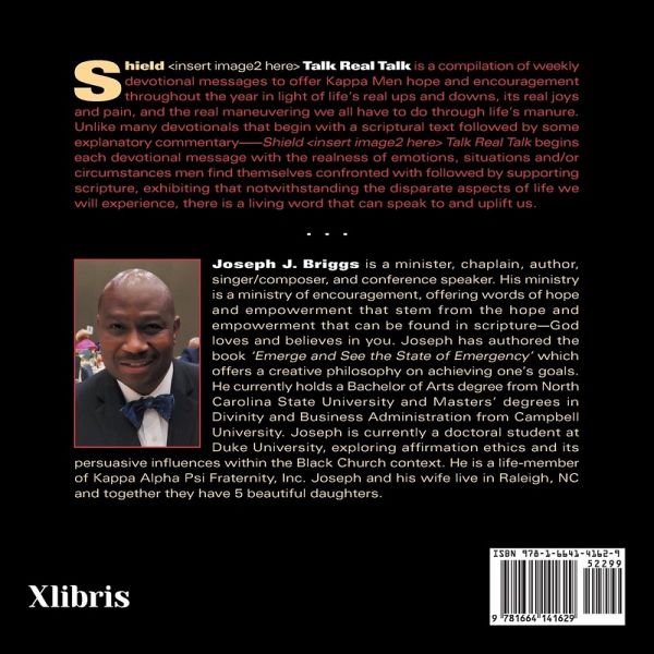 Shield Talk Real Talk is a compilation of weekly devotional messages to offer Kappa Men hope and encouragement throughout the year in light of life's real ups and downs, its real joys and pain, and the real maneuvering we all have to do through life's manure. Unlike many devotionals that begin with a scriptural text followed by some explanatory commentary--Shield Talk Real Talk begins each devotional message with the realness of emotions, situations and/or circumstances men find themselves confronted with followed by supporting scripture, exhibiting that notwithstanding the disparate aspects of life we will experience, there is a living word that can speak to and uplift us.