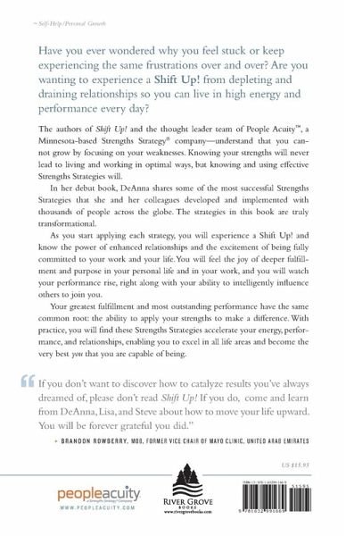 A Shift Up! Have you ever wondered why you feel stuck or keep experiencing the same frustrations over and over? Are you wanting to experience a Shift Up! from depleting and draining relationships so you can live in high energy and performance every day? Life-Changing Strategies. The authors of Shift Up! and the thought leader team of People Acuity(TM), a Minnesota-based Strengths Strategy® company understand that you cannot grow by focusing on your weaknesses. Knowing your strengths will never lead to living and working in optimal ways, but knowing and using effective Strengths Strategies will. In her debut book, DeAnna shares some of the most successful Strengths Strategies that she and her colleagues developed and implemented with thousands of people across the globe. The strategies in this book are truly transformational. Positive Effects. As you start applying each strategy, you'll experience a Shift Up! and: • know the power of enhanced relationships • experience the excitement of being fully committed to your work and your life • feel the joy of deeper fulfillment and purpose in your personal life and in your work • watch your performance rise • gain the ability to intelligently influence others to join you Optimal Energy, Performance, and Relationships. Your greatest fulfillment and most outstanding performance have the same common root: the ability to apply your strengths to make a difference. With practice, you'll find these Strengths Strategies accelerate your energy, performance, and relationships, enabling you to excel in all life areas and become the very best you that you are capable of being.