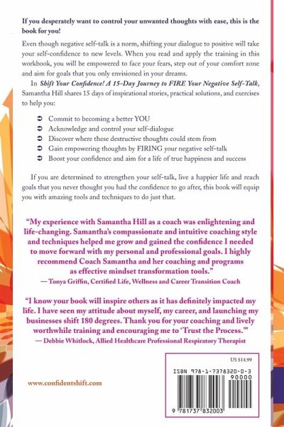 If you desperately want to control your unwanted thoughts with ease, this is the book for you! Even though negative self-talk is a norm, shifting your dialogue to positive will take your self-confidence to new levels. When you read and apply the training in this workbook, you will be empowered to face your fears, step out of your comfort zone and aim for goals that you only envisioned in your dreams. In Shift Your Confidence! A 15-Day Journey to FIRE Your Negative Self-Talk, Samantha Hill shares 15 days of inspirational stories, practical solutions, and exercises to help you:Commit to becoming a better YOU Acknowledge and control your self-dialogue Discover where these destructive thoughts could stem from Gain empowering thoughts by FIRING your negative self-talk Boost your confidence and aim for a life of true happiness and success If you are determined to strengthen your self-talk, live a happier life and reach goals that you never thought you had the confidence to go after, this book will equip you with amazing tools and techniques to do just that.