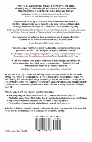 Are you ready to unlock your hidden potential? Do you want to empower yourself and discover how to manifest your definition of success regardless of your background or the specific obstacles holding you back? Reading Shift Your Paradigm is a huge step in the right direction. See this as a tool to help you on your path towards shifting your paradigms. Your empowered paradigms will significantly increase your ability to achieve success, have meaningful relationships, make a difference to society and secure a fulfilling and happy life. Within the pages of Shift Your Paradigm, you'll find stories about: How your paradigm is created, what factors impact it, and how you can take control of it What factors allowed Gandhi, Martin Luther King, Jr., and other leaders to become larger-than-life figures Why society works the way it does and what you can do to positively impact it The importance and power of close relationships with yourself, family, and others Author Dionis Rodriguez shares this information, interwoven with stories from his own life, in the hopes that you will build the foundation you need to unlock your full and powerful potential.