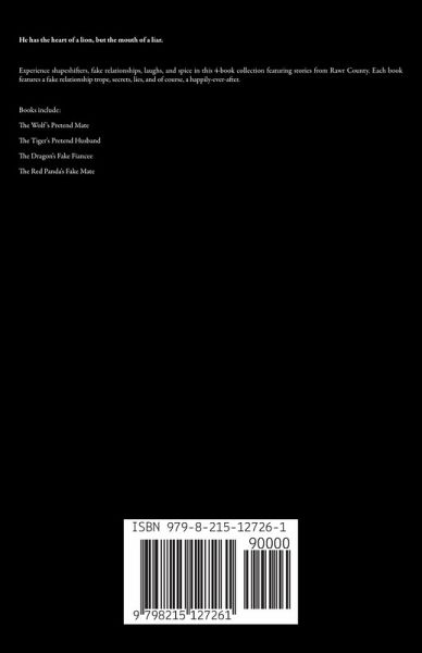 He has the heart of a lion, but the mouth of a liar. Experience shapeshifters, fake relationships, laughs, and spice in this 4-book collection featuring stories from Rawr County. Each book features a fake relationship trope, secrets, lies, and of course, a happily-ever-after. Books include: The Wolf's Pretend Mate The Tiger's Pretend Husband The Dragon's Fake Fiancee The Red Panda's Fake Mate 4 - The Wolf's Pretend Mate Daphne has had her heart set on being Alpha ever since she was a little cub. Everything she's done has been to prepare her for taking over the Rawr County Wolf Pack. She knows she's going to be a fair and wonderful leader, but when the pack elders hit her with a leadership requirement, she's caught off guard. She has to get MARRIED? She doesn't even have time to date! How is she going to find a husband? Fletcher is the kind of guy who never turns down a dare. He especially doesn't turn down a dare from curvy, luscious women he meets in bars. When one particularly adorable woman dares him to marry her, he thinks it's a joke, but when he wakes up married to the wolf Alpha the next day, he realizes he just might be in over his head. Will the pack accept Fletcher as Daphne's mate? Will they suspect their marriage isn't exactly legit? And who in the pack seems determine to sabotage Daphne's rule as leader? 5 - The Tiger's Pretend Husband She needs protection that only he can offer. Darla isn't exactly a tiny person. In fact, she's more than a person. She's a tiger shifter. Still, her kitty-cat claws are no match for the people who are hunting her. She crossed the wrong people one too many times, and now they're after her. But Darla has a plan. What she needs, more than anything else, is protection. What she wants, more than anything else, is Kapono. Will he agree to marry her to keep her safe? He may be able to protect her body, but can he protect her heart? 6 - The Dragon's Fake Fiancee Cosmo has been living in Rawr County for the last 10 years because he hates himself and wants to be miserable. Dragon Isle was no good for him. Everyone there was too happy and joyful. A dragon like him deserves to be unhappy. When his family tries to set him up with a childhood friend to date, he blurts out a lie: he's engaged. It's not true. But when they surprise him with an unexpected visit, he grabs his nearest employee, Athena, and introduces her as his fiancée. What could possibly go wrong? 7 - The Red Panda's Fake Mate Jennifer lives alone. She works alone. She travels alone. Everything in her life is centered around that solitude. She doesn't do well with crowds or groups of people, so she's chosen a job where she can work by herself without being distracted. When her boss requests her presence on a company retreat that could lead to an incredible promotion, she realizes she needs to make herself seem as mature, well-rounded, and stable as possible. What better way than by bringing her mate along? The problem is that Jennifer doesn't have a mate. Red pandas are notorious for living on their own or in very, very small groups, and she doesn't exactly have a list of boyfriends on call. When a chance encounter leads to the perfect opportunity to claim a fake mate as her own, Jennifer doesn't resist. After all, what's the worst thing that could happen?