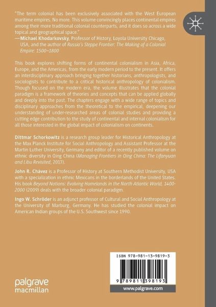 Dittmar Schorkowitz is a research group leader for Historical Anthropology at the Max Planck Institute for Social Anthropology and Assistant Professor at the Martin Luther University, Germany and editor of a recently published volume on ethnic diversity in Qing China (Managing Frontiers in Qing China: The Lifanyuan and Libu Revisited, 2017). John R. Chávez is a Professor of History at Southern Methodist University, USA with a specialization in ethnic Mexicans in the borderlands of the United States. His book Beyond Nations: Evolving Homelands in the North Atlantic World, 1400-2000 (2009) deals with the broader colonial paradigm. Ingo W. Schröder is an adjunct professor of Cultural and Social Anthropology at the University of Marburg, Germany. He has studied the colonial impact on American Indian groups of the U.S. Southwest since 1990.