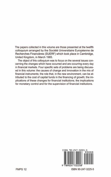 The papers collected in this volume are those presented at the twelfth Colloquium arranged by the Societe Universitaire Europeenne de Re cherches Financieres (SUERF) which took place in Cambridge in March 1985. The Society is supported by a large number of central banks, commercial banks and other financial and business institutions, by treasury officials and by academics and others interested in monetary and financial problems. Since its establishment in 1963 it has developed as a forum for the exchange of information, research results and ideas, valued by academics and practi tioners in these fields, including central bank officials and civil servants responsible for formulating and applying monetary and financial policies. A major activity of SUERF is to organise and conduct Colloquia on subjects of topical interest to members. The titles, places and dates of previous Colloquia for which volumes of the collected papers were pub lished are noted on the last page of this volume.Volumes were not produced for Colloquia held at Tarragona, Spain in October 1970 under the title 'Monetary Policy and New Developments in Banking' and at Stras bourg, France in January 1972 under the title 'Aspects of European Mone tary Union'.