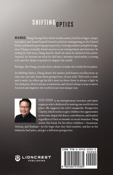As a child, Dung Duong fled a third-world country, lived in refugee camps, was jailed, and found himself homeless before immigrating to the United States, ultimately growing up in poverty. A strong student and gifted engineer, Dung eventually found success as an entrepreneur and investor. In telling his full story, Dung doesn't dwell on what he lacked in his youth. Instead, he focuses on what he did have: intrinsic motivation, a strong will, and the desire to positively impact the world. Perhaps, like Dung, you also have a desire to make the world a better place. In Shifting Optics, Dung shares his stories and honest recollections so that you can take from them perspective, if you wish. Told with a wink and a smile, he offers up his life's story to show there is always a light in the darkness, there's always a tomorrow, and there's always a way to move forward and improve the world in our own unique way.
