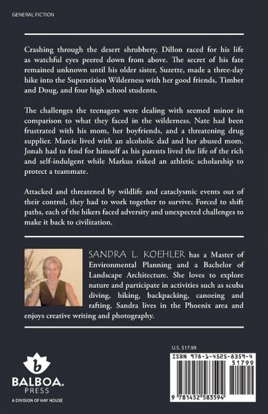 Crashing through the desert shrubbery, Dillon raced for his life as watchful eyes peered down from above. The secret of his fate remained unknown until his older sister, Suzette, made a three-day hike into the Superstition Wilderness with her good friends, Timber and Doug, and four high school students. The challenges the teenagers were dealing with seemed minor in comparison to what they faced in the wilderness. Nate had been frustrated with his mom, her boyfriends, and a threatening drug supplier. Marcie lived with an alcoholic dad and her abused mom. Jonah had to fend for himself as his parents lived the life of the rich and self-indulgent while Markus risked an athletic scholarship to protect a teammate. Attacked and threatened by wildlife and cataclysmic events out of their control, they had to work together to survive. Forced to shift paths, each of the hikers faced adversity and unexpected challenges to make it back to civilization.
