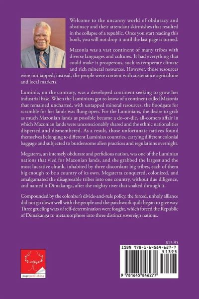 Welcome to the uncanny world of obduracy and obstinacy and their attendant skirmishes that resulted in the collapse of a republic. Once you start reading this book, you will not drop it until the last page is turned. Mazonia was a vast continent of many tribes with diverse languages and cultures. It had everything that could make it prosperous, such as temperate climate and rich mineral resources. However, those resources were not tapped; instead, the people were content with sustenance agriculture and local markets. Luminia, on the contrary, was a developed continent seeking to grow her industrial base. When the Luminians got to know of a continent called Mazonia that remained uncharted, with untapped mineral resources, the floodgate for scramble for her lands was flung open. For the Luminians, the desire to grab as much Mazonian lands as possible became a do-or-die, all-comers affair in which Mazonian lands were unconscionably shared and the ethnic nationalities dispersed and dismembered. As a result, those unfortunate natives found themselves belonging to different Luminian countries, carrying different colonial baggage and subjected to burdensome alien practices and regulations overnight. Megaterra, an intensely obdurate and perfidious nation, was one of the Luminian nations that vied for Mazonian lands, and she grabbed the largest and the most lucrative chunk, inhabited by three discordant big tribes, each of them big enough to be a country of its own. Megaterra conquered, colonized, and amalgamated the disagreeable tribes into one country, without due diligence, and named it Dimakanga, after the mighty river that snaked through it. Compounded by the colonizer's divide-and-rule policy, the forced, unholy alliance did not go down well with the people and the patchwork quilt began to give way. Three grueling wars of self-determination were fought, which forced the Republic of Dimakanga to metamorphose into three distinct sovereign nations.