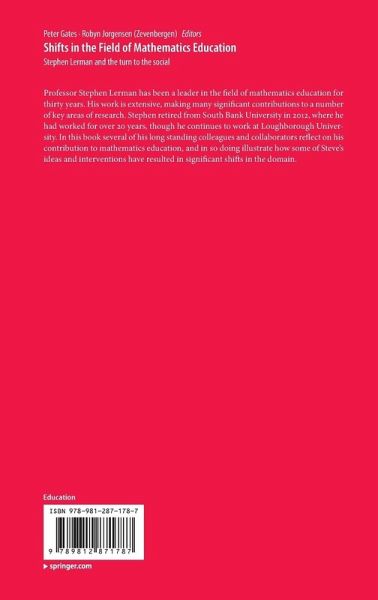 Acknowledgements.- Contributors.- Mapping the Field and Documenting the Contribution.- Section 1 - Steve the man.- 1. The social turn - from up close and personal.- 2. Steve Lerman: the man and his work.- Section 2 - Steve within the Field.- 3. Issues of equity and justice in the construction of Steve Lerman.- 4. Tracing the advances in the field of mathematics education.- 5. A Speech Act in Mathematics Education - The Social Turn.- Section 3 - Steve Photo Selection.- 6. Steve through the years.- Section 4 - Steve and international cooperation.- 7. International Research Collaborations: An Australian Perspective.- 8. Researching the role of the teacher in creating socially productive classrooms that facilitate mathematics learning.- Section 5 - Steve's theoretical contributions.- 9. Turning mathematical knowledge for teaching social.- 10. Knowledge construction: Individual or social? .- 11. Intersubjectivity in mathematics teaching: meaning-making from constructivist and/or sociocultural perspectives? .- 12. Learning as participatory transformation - a reflection inspired by Steve Lerman's papers and practice.- 13. The philosophy of mathematics education: Stephen Lerman's contributions.- 14. Lerman's Perspectives on Information and Communication Technology.- 15. Troubling mathematics "learners".