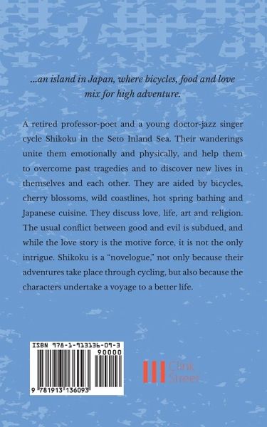 ...an island in Japan, where bicycles, food and love mix for high adventure. A retired professor-poet and a young doctor-jazz singer cycle Shikoku in the Seto Inland Sea. Their wanderings unite them emotionally and physically, and help them to overcome past tragedies and to discover new lives in themselves and each other. They are aided by bicycles, cherry blossoms, wild coastlines, hot spring bathing and Japanese cuisine. They discuss love, life, art and religion. The usual conflict between good and evil is subdued, and while the love story is the motive force, it is not the only intrigue. Shikoku is a "novelogue," not only because their adventures take place through cycling, but also because the characters undertake a voyage to a better life.