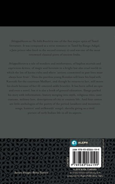 Shilappadikaram or the Ankle Bracelet is one of the five major epics of Tamil literature. It was composed as a verse romance in Tamil by Ilango Adigal, a Jain prince who lived in the second century ad and was one of the most renowned classical poets of ancient India. Shilappadikaram is a tale of wonders and misfortunes, of hapless mortals and capricious deities, of magic and heroism in a bright but also cruel world in which the law of karma rules and where 'actions committed in past lives must always bear fruit'. Thus the peerless young Kovalan will leave his loyal wife Kannaki for the courtesan Madhavi and though he returns to her, still meets his death because of her ill-omened ankle bracelet. It has been called an epic and even a novel, but it is also a book of general education. Ilango packed his story with information: history merging into myth, religious rites, caste customs, military lore, descriptions of city or country life. And four cantos are little anthologies of the poetry of the period (seashore and mountain songs, hunters' and milkmaids' songs), thereby giving us a vivid picture of early Indian life in all its aspects.