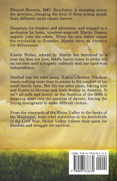 ***Finalist Regional Fiction 2021 Next Generation Indie Book Awards A sweeping saga of love and loss, self-discovery and sacrifice set during the U.S. Civil War era 1849: Revolution is sweeping across Rhenish-Bavaria, changing the lives of three young people from different social classes forever. Desperate for freedom and adventure, and trapped in a profession he hates, nineteen-year-old Martin Dupree eagerly joins the rebels. When his own father causes the revolution to flounder, Martin turns to America for deliverance. Katrin Weber, adored by Martin but betrothed to a man she does not love, boldly leaves home to strike out on her own until a tragedy suddenly ends her hard-won independence. Drafted into the rebel army, Katrin's brother Nikolaus wants nothing more than to return to the comfort of his small family farm. But life has other plans, forcing him and Katrin to likewise seek their destiny in America. It isn't all milk and honey, as the America of the 1850s is breaking apart over the question of slavery, forcing the young immigrants to make difficult choices. From the vineyards of the Rhine Valley to the banks of the Mississippi, from rebel skirmishes to the battlefields of the Civil War, Shiloh Valley follows their quest for freedom and struggle for survival.