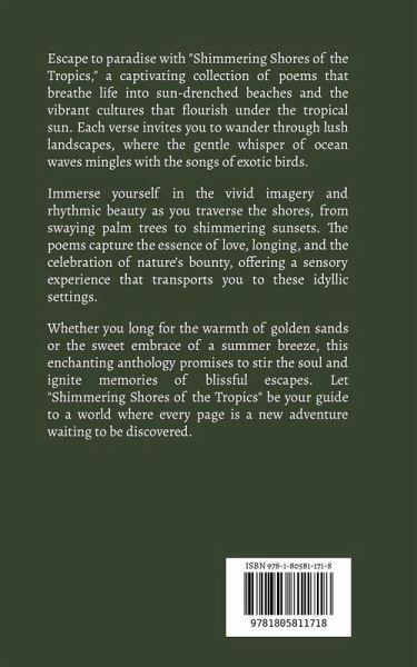 Escape to paradise with "Shimmering Shores of the Tropics," a captivating collection of poems that breathe life into sun-drenched beaches and the vibrant cultures that flourish under the tropical sun. Each verse invites you to wander through lush landscapes, where the gentle whisper of ocean waves mingles with the songs of exotic birds. Immerse yourself in the vivid imagery and rhythmic beauty as you traverse the shores, from swaying palm trees to shimmering sunsets. The poems capture the essence of love, longing, and the celebration of nature's bounty, offering a sensory experience that transports you to these idyllic settings. Whether you long for the warmth of golden sands or the sweet embrace of a summer breeze, this enchanting anthology promises to stir the soul and ignite memories of blissful escapes. Let "Shimmering Shores of the Tropics" be your guide to a world where every page is a new adventure waiting to be discovered.