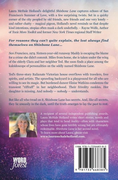 For reasons they can't quite explain, the lost always find themselves on Shinbone Lane... San Francisco, 1974. Sixteen-year-old runaway Maddy is escaping the blame for a crime she didn't commit. Miles from home, she is taken under the wing of the elderly Clara and her neighbor Ted. She soon finds a place among the kaleidoscope of personalities on the oddly named Shinbone Lane. Ted's three-story Italianate Victorian house overflows with travelers, free spirits, and artists. His backyard is a haven for all who can see its magic, including a verbal pigeon of ancient lineage. But burdened dancer Eloise Watkins condemns the transient "riffraff" in her neighborhood. Their frivolity rankles. Her daughter is missing. And nobody - nobody - understands. But like all who tread on it, Shinbone Lane has secrets. And, like all secrets, they lie uneasily in the dark, until the truth emerges to lay the past to rest. At the intersection of magic and reality lies Shinbone Lane and its unconventional cast of characters who converge in one beguiling brew of life.