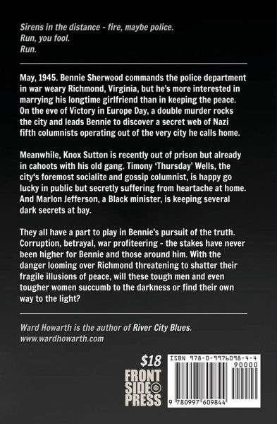 May, 1945. Bennie Sherwood commands the police department in war weary Richmond, Virginia, but he's more interested in marrying his longtime girlfriend than in keeping the peace. On the eve of Victory in Europe Day, a double murder rocks the city and leads Bennie to discover a secret web of Nazi fifth columnists operating out of the very city he calls home. Meanwhile, Knox Sutton is recently out of prison but already in cahoots with his old gang. Timony 'Thursday' Wells, the city's foremost socialite and gossip columnist, is happy go lucky in public but secretly suffering from heartache at home. And Marlon Jefferson, a Black minister, is keeping several dark secrets at bay. They all have a part to play in Bennie's pursuit of the truth. Corruption, betrayal, war profiteering - the stakes have never been higher for Bennie and those around him. With the danger looming over Richmond threatening to shatter their fragile illusions of peace, will these tough men and even tougher women succumb to the darkness or find their own way to the light?