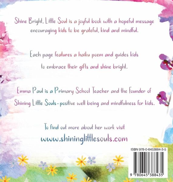 Shine Bright, Little Soul is a joyful book with a hopeful message encouraging kids to be grateful, kind and mindful. Each page features a haiku poem and guides kids to embrace their gifts and shine bright. Emma Paul is a Primary School Teacher and the Founder of Shining Little Souls - positive well being and mindfulness for kids. To find out more about her work visit www.shininglittlesouls.com