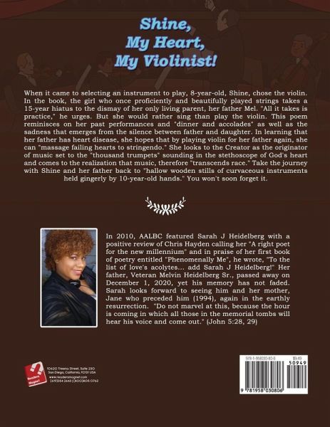 When it came to selecting an instrument to play, 8-year-old, Shine, chose the violin. In the book, the girl who once proficiently and beautifully played strings takes a 15-year hiatus to the dismay of her only living parent, her father Mel. "All it takes is practice," he urges. But she would rather sing than play the violin. This poem reminisces on her past performances and "dinner and accolades" and the sadness that emerges from the silence between father and daughter. In learning that her father has heart disease, she hopes that by playing violin for her father again, she can "massage failing hearts to stringendo." She looks to the Creator as the originator of music set to the "thousand trumpets" sounding in the stethoscope of God's heart and comes to the realization that music, therefore "transcends race." Take the journey with Shine and her father back to "hallow wooden stills of curvaceous instruments held gingerly by 10-year-old hands." You won't soon forget it.