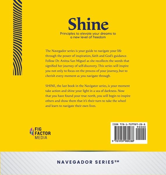 The Navegador series is your guide to navigate your life through the power of inspiration, faith and God's guidance. Follow Dr. Anitza San Miguel as she recollects the words that signified her journey of self-discovery. This series will inspire you not only to focus on the process of your journey, but to cherish every moment as you navigate through. Shine, the last book in the Navigator series, is your moment take action and shine your light in a sea of darkness. Now that you have found your true north, you will begin to inspire others and show them that it's their turn to take the wheel and learn to navigate their own lives.