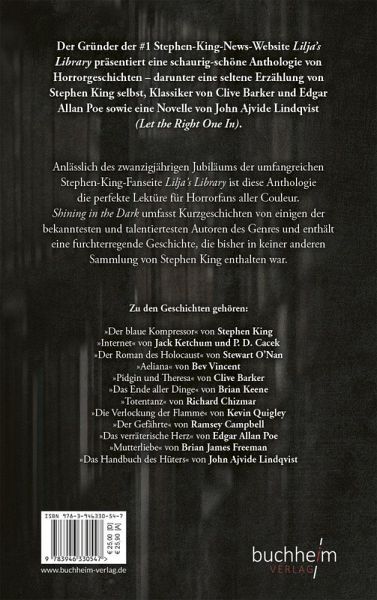Der Gründer der #1 Stephen-King-News-Website Lilja's Library präsentiert eine schaurig-schöne Anthologie von Horrorgeschichten - darunter eine seltene Erzählung von Stephen King selbst, Klassiker von Clive Barker und Edgar Allan Poe sowie eine Novelle von John Ajvide Lindqvist ( Let the Right One In ). Anlässlich des zwanzigjährigen Jubiläums der umfangreichen Stephen-King-Fanseite 'Lilja's Library - The World of Stephen King' ist diese Anthologie die perfekte Lektüre für Horrorfans aller Couleur. Shining in the Dark umfasst Kurzgeschichten von einigen der bekanntesten und talentiertesten Autoren des Genres und enthält eine furchterregende Geschichte, die bisher in keiner anderen Sammlung von Stephen King enthalten war. Zu den Geschichten gehören: 'Der blaue Kompressor' von Stephen King 'Internet' von Jack Ketchum und P. D. Cacek 'Der Roman des Holocaust' von Stewart O'Nan 'Aeliana' von Bev Vincent 'Pidgin und Theresa' von Clive Barker 'Das Ende aller Dinge' von Brian Keene 'Totentanz' von Richard Chizmar 'Die Verlockung der Flamme' von Kevin Quigley 'Der Gefährte' von Ramsey Campbell 'Das verräterische Herz' von Edgar Allan Poe 'Mutterliebe' von Brian James Freeman 'Das Handbuch des Hüters' von John Ajvide Lindqvist