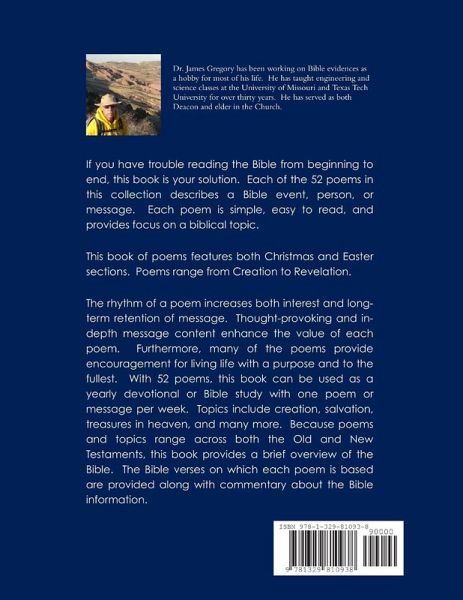 If you have trouble reading the Bible from beginning to end, this book is your solution. Each of the 52 poems in this collection describes a Bible event, person, or message. Each poem is simple, easy to read, and provides focus on a biblical topic. This book of poems features both Christmas and Easter sections. Poems range from Creation to Revelation.