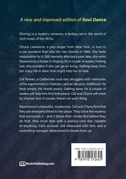 Shining is a mystery romance, a fantasy set in the world of rock music of the 1970s. Chyna Lawrence, a pop singer from New York, is hurt in a car accident that kills her two friends in 1969. She feels responsible for it. Still mentally affected a year later, she rents Ravenwood, a house in Virginia, for a couple of weeks. Feeling lost, she wonders if she can go on living. Getting away from her crazy life in New York might help her to heal. Cal Rowan, a Californian rock star, struggles with memories of his experiences in Vietnam, and an abusive childhood. He feels empty. He needs peace. Getting away for a couple of weeks will help him find that peace. Cal and Chyna will meet by chance; but of course, there's no such thing. Ravenwood is beautiful, mysterious. Cal and Chyna find that they are strangely linked to the place. They solve the mystery that surrounds it - and it blows their minds! But before they do that, they must deal with a jealous rock star capable of anything; Cal's ex-lover, still obsessed with him; and a controlling manager determined to break them up.