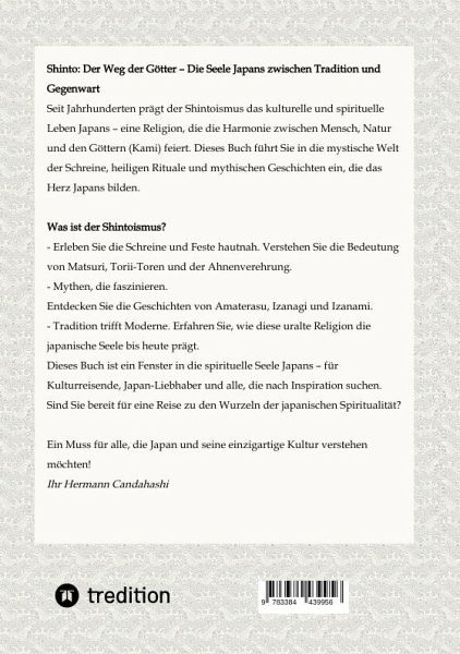 Shinto: Der Weg der Götter II - Die Seele Japans zwischen Tradition und GegenwartEntdecken Sie mit "Shinto: Der Weg der Götter II" eine einzigartige Reise in die faszinierende Welt des Shintoismus, der ältesten Religion Japans. Dieses Buch entführt Sie in eine harmonische Verbindung von Tradition und Moderne, in der die Verehrung der Natur, der Ahnen und der Götter (Kami) bis heute eine zentrale Rolle spielen.Ob als Reisender, Japan-Liebhaber oder spirituell Interessierter - dieses Buch gibt Ihnen wertvolle Einblicke in die Geschichte, Rituale und kulturellen Schätze des Shinto. Verstehen Sie die Bedeutung der heiligen Schreine, das Geheimnis der Torii-Tore und die tief verwurzelten Werte, die das Leben der Menschen in Japan prägen.Was dieses Buch bietet:Einblicke in die Shinto-Rituale und Feste (Matsuri): Lernen Sie, wie Spiritualität im Alltag der Japaner gelebt wird.Verständnis der japanischen Mythologie: Entdecken Sie die Legenden um Amaterasu, Izanagi und Izanami.Verbindung von Tradition und Moderne: Wie hat sich der Shintoismus bis heute entwickelt?Praktische Orientierung: Perfekt für Reisende und alle, die die spirituelle Essenz Japans verstehen möchten.Inspirierende Geschichten: Erfahren Sie, wie der Shintoismus Harmonie und Naturverbundenheit fördert.Dieses Buch ist nicht nur eine informative Einführung, sondern ein inspirierender Leitfaden, der den Leser tief in die Seele Japans eintauchen lässt.Erwecken Sie mit mir die altehrwürdigen Traditionen Japans zum Leben und erfahren Sie, wie diese uralte Religion die moderne Welt beeinflusst und lassen Sie sich von der spirituellen Schönheit Japans verzaubern.Ihr Hermann Cadahashi