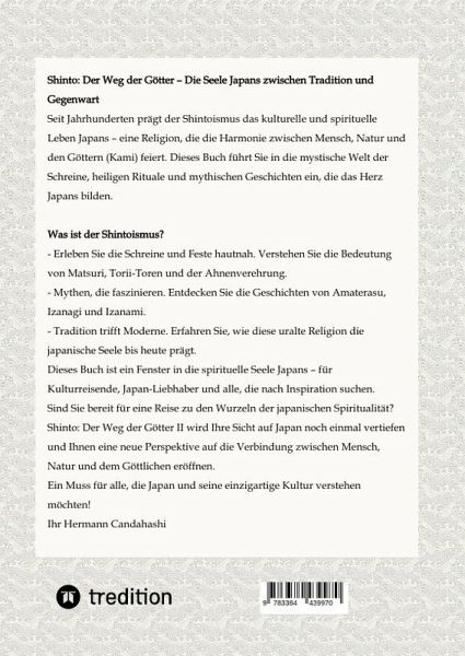 Shinto: Der Weg der Götter II - Die Seele Japans zwischen Tradition und GegenwartEntdecken Sie mit "Shinto: Der Weg der Götter II" eine einzigartige Reise in die faszinierende Welt des Shintoismus, der ältesten Religion Japans. Dieses Buch entführt Sie in eine harmonische Verbindung von Tradition und Moderne, in der die Verehrung der Natur, der Ahnen und der Götter (Kami) bis heute eine zentrale Rolle spielen.Ob als Reisender, Japan-Liebhaber oder spirituell Interessierter - dieses Buch gibt Ihnen wertvolle Einblicke in die Geschichte, Rituale und kulturellen Schätze des Shinto. Verstehen Sie die Bedeutung der heiligen Schreine, das Geheimnis der Torii-Tore und die tief verwurzelten Werte, die das Leben der Menschen in Japan prägen.Was dieses Buch bietet:Einblicke in die Shinto-Rituale und Feste (Matsuri): Lernen Sie, wie Spiritualität im Alltag der Japaner gelebt wird.Verständnis der japanischen Mythologie: Entdecken Sie die Legenden um Amaterasu, Izanagi und Izanami.Verbindung von Tradition und Moderne: Wie hat sich der Shintoismus bis heute entwickelt?Praktische Orientierung: Perfekt für Reisende und alle, die die spirituelle Essenz Japans verstehen möchten.Inspirierende Geschichten: Erfahren Sie, wie der Shintoismus Harmonie und Naturverbundenheit fördert.Dieses Buch ist nicht nur eine informative Einführung, sondern ein inspirierender Leitfaden, der den Leser tief in die Seele Japans eintauchen lässt.Erwecken Sie mit mir die altehrwürdigen Traditionen Japans zum Leben und erfahren Sie, wie diese uralte Religion die moderne Welt beeinflusst und lassen Sie sich von der spirituellen Schönheit Japans verzaubern.Ihr Hermann Cadahashi