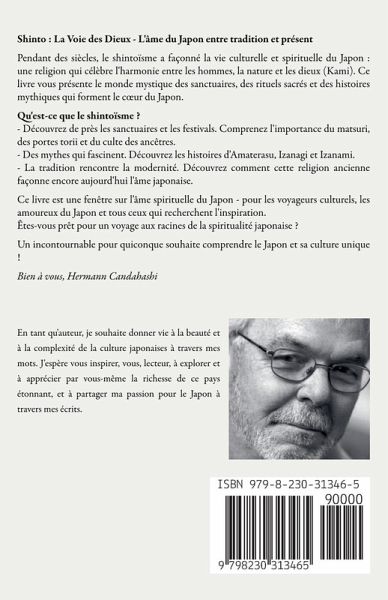 Shinto : La Voie des Dieux II - L'âme du Japon entre tradition et présent Avec Shinto : La Voie des Dieux II , découvrez un voyage unique dans le monde fascinant du shintoïsme, la plus ancienne religion du Japon. Ce livre vous entraîne dans une combinaison harmonieuse de tradition et de modernité, dans laquelle le culte de la nature, des ancêtres et des dieux (Kami) jouent encore aujourd'hui un rôle central. Que vous soyez un voyageur, un amoureux du Japon ou une personne intéressée par la spiritualité, ce livre vous donne un aperçu précieux de l'histoire, des rituels et des trésors culturels du shintoïsme. Comprenez l'importance des sanctuaires sacrés, le mystère des portes torii et les valeurs profondément enracinées qui façonnent la vie des Japonais. Ce que propose ce livre : Aperçu des rituels et festivals shinto (Matsuri) : Découvrez comment la spiritualité est vécue au quotidien par les Japonais. Comprendre la mythologie japonaise : Découvrez les légendes d'Amaterasu, Izanagi et Izanami. Allier tradition et modernité : Comment le shintoïsme s'est-il développé jusqu'à nos jours ? Orientation pratique : Parfait pour les voyageurs et tous ceux qui souhaitent comprendre l'essence spirituelle du Japon. Histoires inspirantes : découvrez comment le shintoïsme favorise l'harmonie et la connexion avec la nature. Ce livre n'est pas seulement une introduction informative, mais un guide inspirant qui plonge le lecteur au plus profond de l'âme du Japon. Rejoignez-moi pour donner vie aux traditions séculaires du Japon, découvrir comment cette religion ancienne influence le monde moderne et être enchanté par la beauté spirituelle du Japon. Bien à vous, Hermann Cadahashi