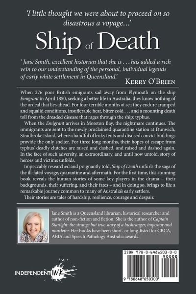When 276 poor British emigrants sail away from Plymouth on the ship Emigrant in April 1850, seeking a better life in Australia, they know nothing of the ordeal that lies ahead. For four terrible months at sea they endure cramped and squalid conditions, insufferable heat, bitter cold ... and a mounting death toll from the dreaded disease that rages through the ship: typhus. When the Emigrant arrives in Moreton Bay, the nightmare continues. For three long months in quarantine at Stradbroke Island, the immigrants' hopes are raised and dashed, and raised and dashed again. Impeccably researched and poignantly told, Ship of Death unfurls the true saga of the ill-fated voyage, quarantine and aftermath. For the first time, this stunning book reveals the human stories of some key players in the drama - their backgrounds, their suffering, and their fates - and in doing so, brings to life a remarkable journey common to many of Australia's early settlers. Their stories are tales of hardship, resilience, courage and despair.