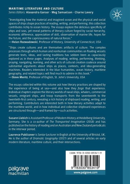 Chapter 1: Stephen R. Berry (Associate Professor of History, Simmons College, US), "The Sailing Ship as a School of Virtue".- Chapter 2: Christian Algar (Curator, Printed Heritage Collections, British Library), "Books with Providence: The Power and Influence of a Puritan Naval Chaplain's Library at Sea".- Chapter 3: Tamsin Badcoe (Lecturer in English, University of Bristol, UK), "Writing the Cabin as Cloister in the Diary of Sister Mary Paul Mulquin".- Chapter 4: Jimmy Packham (Lecturer in North American Literature, University of Birmingham, UK): "The Maritime Self on the American Whaleship".- Chapter 5: Laurence Publicover (Senior Lecturer in English, University of Bristol, UK) and Eli Cumings (Postgraduate Researcher, University of Cambridge), "Shipboard Diaries as Navigational Instruments".- Chapter 6: Helen Chambers (Research Associate, The Open University, UK), "The Torrens as a space of writing, reading, and performance".- Chapter 7: Mary Isbell(Assistant Professor of English, University of New Haven, US), "Recognition and Anonymity: Shipboard Theatricals and Newspapers aboard USS Macedonian".- Chapter 8: Susann Liebich (Postdoctoral Fellow in History, Heidelberg University, Germany), "Identity and Community in New Zealand Troopship Magazines of the First World War".- Chapter 9: Tamson Pietsch (Senior Lecturer in Social and Political Sciences, University of Technology Sydney, Australia), "The laboratory method made mobile: learning aboard the 1926-27 Floating University".- Chapter 10: David Punter (Professor of English, University of Bristol, UK), "Down to the Sea in Ships".- Afterword: Hester Blum (Associate Professor of English, Penn State University, USA).