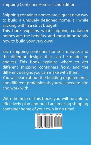 SHIPPING CONTAINER HOMES Not only are shipping container homes eco friendly, they're also extremely unique, fun to build, and are way cheaper to build than a regular house! These container homes have been rapidly growing in popularity, and for good reason. If you'd like to get started with building a container home, then this is the right book for you! Through reading this book you will discover what materials you need for your container home, what contractors you may need to hire, and what permits you will require. You will also get some great ideas for the design of your container home! There are several sample plans inside this book that will really get you thinking about the design style you'd like. You'll also discover how to turn a shipping container into a swimming pool! This book breaks the whole building process is broken down into simple steps. You can choose to follow these steps yourself, or hire people to complete the steps for you. Either way, this book is the perfect place to begin if you're interested in building a shipping container home! Here Is A Preview Of What’s Included… The Different Sizes of Shipping Containers How to Source Your Containers Which Building Permits You Will Need Step by Step Guide to Building Your Container Home Shipping Container Design Ideas How to Build a Shipping Container Pool Shipping Container Home Sample Plans Much, Much More!