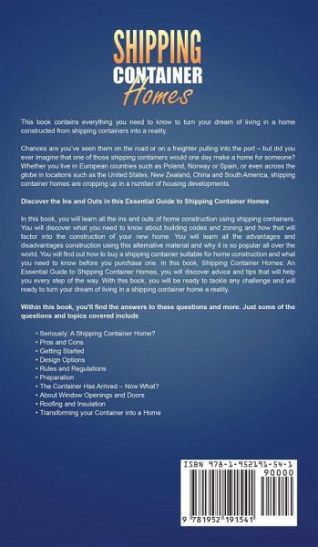 Turn Your Dream of Living in a Shipping Container Home Into Reality This book contains everything you need to know to turn your dream of living in a home constructed from shipping containers into a reality. Chances are you’ve seen them on the road or on a freighter pulling into the port – but did you ever imagine that one of those shipping containers would one day make a home for someone? Whether you live in European countries such as Poland, Norway or Spain, or even across the globe in locations such as the United States, New Zealand, China and South America, shipping container homes are cropping up in a number of housing developments. Discover the Ins and Outs in this Essential Guide to Shipping Container Homes: In this book, you will learn all the ins and outs of home construction using shipping containers. You will discover what you need to know about building codes and zoning and how that will factor into the construction of your new home. You will learn all the advantages and disadvantages construction using this alternative material and why it is so popular all over the world. You will find out how to buy a shipping container suitable for home construction and what you need to know before you purchase one. In this book, Shipping Container Homes: An Essential Guide to Shipping Container Homes, you will discover advice and tips that will help you every step of the way. With this book, you will be ready to tackle any challenge and will ready to turn your dream of living in a shipping container home a reality. Within this book, you'll find the answers to these questions and more. Just some of the questions and topics covered include: Seriously: A Shipping Container Home? Pros and Cons Getting Started Design Options Rules and Regulations Preparation The Container Has Arrived – Now What? About Window Openings and Doors Roofing and Insulation Transforming your Container into a Home And much more!
