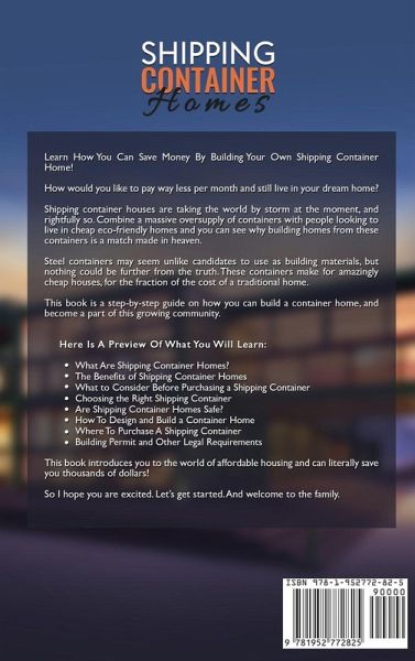 Realize Your Dream of Living in Your Own Shipping Container Home! Learn How You Can Save Money With Insider Tips On How To Build Your Shipping Container Home! How would you like to: - pay way less per month, and - still live in your dream home? That's the promise that a shipping container home offers! Get Your Copy of 'Shipping Container Homes' These tiny houses are taking the world by storm at the moment, and rightfully so. Combine a massive oversupply of containers with people looking to live in cheap homes, that are even eco-friendly, and you can see why building container homes is a match made in heaven. Steel containers make for amazingly cheap houses, for the fraction of the cost of a traditional home. The tiny house movement already adopted shipping container construction as a method of building a new home. However, you do not need to be a fan of tiny houses to appreciate that containers make for excellent and comfortable homes. Imagine the possibilities that come with freeing up the financial resources you are now spending on your mortgage! Well...you have come to the right place. Why You Should Check Out 'Shipping Container Homes' This book is a step-by-step guide on how you can build a container home. I will take you by the hand. You will learn the basics, such as: - The advantages of building a house with a container - Different container sizes, and - What you can expect to pay for one. We will discuss what to consider when laying out the foundation, plumbing, electrical work, interior design, and insulation. And we will also cover: - DIY home containers vs manufactured homes - How to treat the container to turn it into a safe living space, and - How you can turn a small house (because containers can be tiny homes) into a bigger one if you have a family. If you want to know how to build a house with a container, look no further! Pick up your copy now and get inspired to turn your dream into reality.Start Reading 'Shipping Container Homes' Here's What You Will Learn: - What Are Shipping Container Homes? - The Benefits of Shipping Container Homes - What to Consider Before Purchasing a Shipping Container - Choosing the Right Shipping Container - Are Shipping Container Homes Safe? - How To Build A Container Home - Where To Purchase A Shipping Container - And Much More! Finally, as a FREE & EXCLUSIVE BONUS, you're also getting the chapter 'Choosing The Right RV For You' from my other book 'RV Living: A Beginner's Guide To Turning Your Motorhome Dream Into Reality.' To recap: 'Shipping Container Homes' introduces you to the world of affordable housing and can literally save you thousands of dollars! Let's get started, shall we? And welcome to the family. Take action now! Scroll to the top of this page and click the 'Buy Now' button.