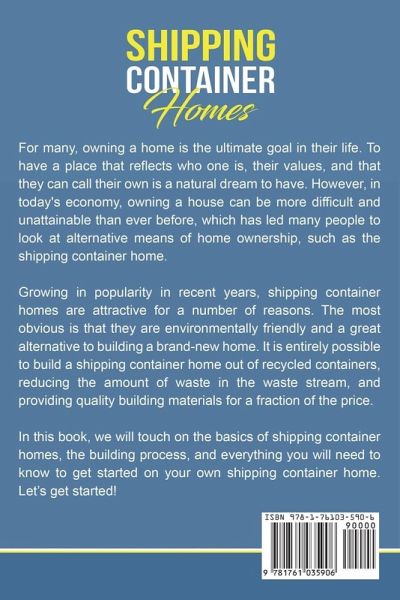 SHIPPING CONTAINER HOMES ¿For many, owning a home is the ultimate goal in their life. To have a place that reflects who one is, their values, and that they can call their own is a natural dream to have. However, in today's economy, owning a house can be more difficult and unattainable than ever before, which has led many people to look at alternative means of home ownership, such as the shipping container home. Growing in popularity in recent years, shipping container homes are attractive for a number of reasons. The most obvious is that they are environmentally friendly and a great alternative to building a brand-new home. It is entirely possible to build a shipping container home out of recycled containers, reducing the amount of waste in the waste stream, and providing quality building materials for a fraction of the price. In this book, we will touch on the basics of shipping container homes, the building process, and everything you will need to know to get started on designing and building your own shipping container home! Here Is A Preview Of What You'll Learn About Inside... What Are Shipping Container Homes Benefits Of Container Homes How To Source Shipping Containers How To Plan A Container Home Build Container Home Design Ideas Required Permits And Permissions Overview Of The Building Process Much, Much More!
