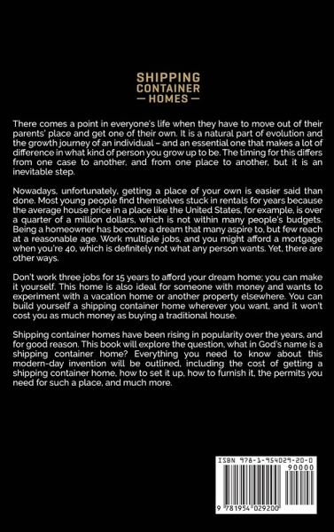 Have you dreamed of owning your own home, but can't afford it? Are you worried that you can't own a house with your current paycheck? If these questions cross your mind, then you have a common concern shared by millions of people around the world. Fortunately, you have found the book that will help you find an answer to this dilemma. In this step-by-step guide to creating shipping container homes, you will learn how you can make a residence for yourself and your family while on a minimal budget. You won't need hundreds of thousands of dollars that a traditional home can cost; you can make a shipping container home for a fraction of that amount. This carefully curated resource will unravel the secrets of shipping container homes so you can even DIY if you wish. Here are some things you will learn: What are shipping container homes? Why you should turn a shipping contained into a home and the advantages of this kind of property. How to choose a location for your shipping container home. How to select the right shipping containers for your home - quality, grade, and age. The proper permits and buildings codes that you will need to make a shipping container home. How to design a shipping container home (several plans are provided as examples). Step-by-step guide on how to start making your shipping container home (setting the foundation, preparing the soil, etc.). Various types of insulation and what will work best with your home. Step-by-step guide on how to add electricity, plumbing, and telephone lines. How to finish the exterior of your container home (roofs, paint, etc.). How to finish the interior of your container home (ceilings, flooring, furniture, and more). How to add security and advanced features to your new shipping container home. With this guidebook, you can build a shipping container home from scratch. We explore the secrets and discover the ins and outs of building a shipping container home from the ground up. Imagine building your dream home at an affordable price as low as $20,000 to $30,000. Tired of living in apartments or rental homes? Have you always dreamed of the perfect home but never thought you could afford it? If so, then you have come to the right place. Read on to make your dream of owning a beautiful house come true. With this book and a few months of hard work, you can have the perfect house within a budget that you can afford. So if you want to learn more about shipping container homes, then scroll up and click the "add to cart" button!