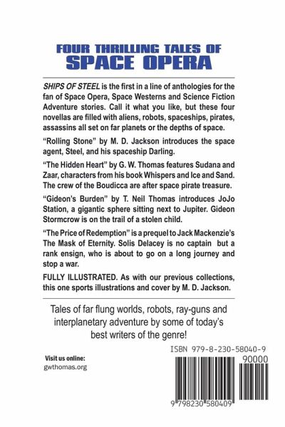 Ships of Steel is the first in a line of anthologies for the fan of Space Opera, Space Westerns and Science Fiction Adventure stories. Call it what you like, but these four novellas are filled with aliens, robots, spaceships, pirates, assassins all set on far planets or the depths of space. "Rolling Stone" by M. D. Jackson introduces the space agent, Steel, and his spaceship Darling. "The Hidden Heart" by G. W. Thomas features Sudana and Zaar, characters from his book Whispers and Ice and Sand. The crew of the Boudicca are after space pirate treasure. "Gideon's Burden" by T. Neil Thomas introduces JoJo Station, a gigantic sphere sitting next to Jupiter. Gideon Stormcrow is on the trail of a stolen child. "The Price of Redemption" is a prequel to Jack Mackenzie's The Mask of Eternity. Solis Delacey is no captain but a rank ensign, who is about to go on a long journey and stop a war.