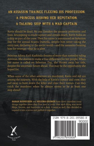 An assassin trainee fleeing his profession. A princess risking her reputation. A talking ship with a mad captain. Ravin should be dead. No one forsakes the assassin profession and lives. Attempting to evade capture and certain death, Ravin hides on a ship as part of the crew. Then his name is announced on Selection Day for the annual Scaera Dumeda, despite him never taking the entry test, declaring to the entire world-and the assassins hunting him for revenge-that he is alive. Princess Adima Radi Kashinda dreams of more than someday ruling Antovan. She desires to make a true difference for her people. When her name is called on Selection Day, she throws away her title, despite the uncertain future ahead. This may be the opportunity she hoped for. When some of the other selectees are murdered, Ravin and Adi are among the suspects. With the help of Ravin's captain and crew, they sail away to hunt down the killer and clear their names. Can they catch the murderer when he always seems to be at least one step ahead?
