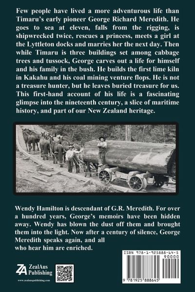 Few people have lived a more adventurous life than Timaru's early pioneer George Richard Meredith. He goes to sea at eleven, falls from the rigging, and rescues a princess. Then he is shipwrecked and lost at sea for a week. During this time, he and fourteen other men in the longboat, narrowly escape death by eating his beloved dog. He is rescued and shipwrecked once more. He signs on with a ship to America but is bullied and runs away when it reaches the port. After more sea adventures he arrives in Australia. Gold fever is running high, so George and a mate run off to the gold fields. Things are going well until George has trouble with his eyes and a doctor advises him to go to New Zealand for his health's sake. When he arrives in Lyttleton he finds work chopping wood in Kaiapoi, and helps build the Sumner Road. After a series of jobs pit-sawing, he meets a girl on the Lyttleton docks and marries her the next day. He shifts his elderly parents to Timaru, and continues carving a living out of the bush near Geraldine. Later in life he builds the first lime kiln in Kakahu, and attempts to float a coal mining venture. In 1913 at seventy-nine he leaves us a written record of his life. This first-hand account of the nineteenth century as seen by George Richard Meredith, is a slice of maritime history, and a fascinating glimpse into early New Zealand.