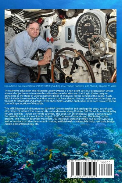 The Maritime Education and Research Society (MERS) is a non-profit 501(c)(3) organization whose aims and objectives are to research and to advance education and training in the techniques pertaining to the study of various maritime fields of endeavor for the benefit of the public. This MERS Research Publication No. 003 (MRP 003) researches and catalogs the ships, aircraft and other items of interest that now mostly rest underwater along Florida's Gulf Shores from Perdido Bay to Cape San Blas - across six Florida counties. The book is in chronological order, beginning with the possible wreck of some Spanish ships in 1533 "between Pensacola and Mobile Bay" to the present. This research describes more than 700 individual seafaring vessels and aircraft wrecks as well as hundreds of other items used in making artificial reefs - automobile hulks, reef balls, bridge rubble, dismantled oil rigs, etc.