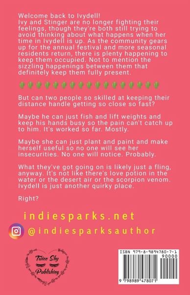 Welcome back to Ivydell!Ivy and Stinger are no longer fighting their feelings, though they're both still trying to avoid thinking about what happens when her time in Ivydell is up. As the community gears up for the annual festival and more seasonal residents return, there is plenty happening to keep them occupied--not to mention the sizzling happenings between them that definitely keep them fully present. But can two people so skilled at keeping their distance handle getting so close so fast? Will the new wear off? What if the sight of Jensen shirtless stops causing a tingling sensation in her core? What if her cropped shirts and tight leggings stop making his calloused fingers ache to feel her softness? Worrying about the future before you've confronted the past is a hard balance to manage. Maybe he can just fish and lift weights and keep his hands busy so the pain can't catch up to him. It's worked so far. Mostly. Maybe she can just plant and paint and make herself useful so no one will see her insecurities. No one will notice. Probably. What they've got going on is probably just a fling, anyway. It's not like there's love potion in the water or the desert air or the scorpion venom. Ivydell is just another quirky place. Right?