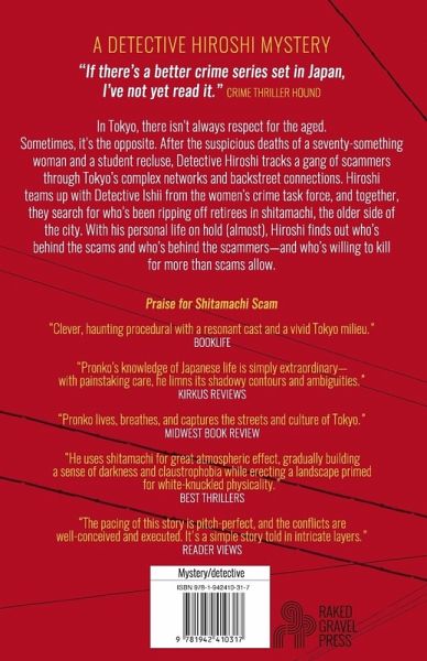 In Tokyo's old quarter, the past doesn't fade. It gets stolen. A frail woman is hit by a motorscooter on a quiet street in the Shitamachi district-one of Tokyo's last neighborhoods untouched by the high-rises and commercial sprawl. To Detective Hiroshi Shimizu, it seems more than an accident. And then the money starts to move. As Hiroshi digs deeper, he uncovers a slick network of scammers targeting Tokyo's elderly-con artists draining savings, pensions, deeds, and lives. With his mentor Takamatsu, his razor-sharp colleague Ishii, and the grizzled ex-sumo detective Sakaguchi at his side, Hiroshi finds that scammers don't only work at the bottom of the heap. The old Tokyo of Shitamachi-the one with shopkeepers, alleyways, customs, and public baths-is disappearing. Urban renewal would beautify Tokyo, but at what cost? What begins as low-level fraud twists into something far darker: a city-wide grift on Tokyo's most expensive currency-real estate. As the case unravels, Hiroshi realizes the low-level criminals aren't the only ones cashing in on Japan's aging society. Every lead takes him deeper into the narrow backstreets and fading lives of Shitamachi, and into the corporate boardrooms and government offices where the powerful work to clear the old to make way for the new. Shitamachi Scam is Tokyo noir at its most human-a slow burn through the city's forgotten alleys, where modern crime runs on smooth talk, and justice doesn't always arrive in time. In Tokyo, respect for the elderly is fading. Along with their savings. Along with their lives. Winner Mystery Independent Press Award (2023) Best of 2024 Mystery/Thriller Booklife Prize (2024) First place Category Chanticleer CLUE (2024) Finalist Best Thrillers.com (2024) Finalist SPR Book Awards (2023) Finalist Chanticleer International Book Awards (2024) Silver Award Reader Views Reviewers Choice Awards Gold Award Literary Titan (2023) "Pronko's knowledge of Japanese life is simply extraordinary-with painstaking care, he limns its shadowy contours and ambiguities. An absorbing drama conveyed with incisive intelligence."-Kirkus Reviews Shitamachi Scam is the sixth book in the Tokyo-based Detective Hiroshi series by award-winning author Michael Pronko.