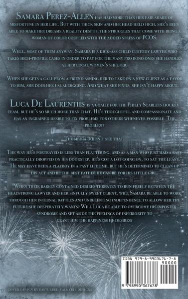 Samara Perez-Allen has had more than her fair share of misfortune in her life. But with thick skin and her head held high, she's been able to make her dreams a reality despite the struggles that come with being a woman of color coupled with the added stress of PCOS. Well, most of them anyway. Samara is a kick-ass child custody lawyer who takes high-profile cases in order to pay for the many pro bono ones she handles at her local women's shelter. When she gets a call from a friend asking her to take on a new client as a favor to him, she does her usual digging. And what she finds, she isn't happy about. Luca De Laurentiis is a goalie for the Philly Scarlets hockey team, but he's so much more than that. He's thoughtful and compassionate and has an ingrained desire to fix problems for others whenever possible. The problem? The media doesn't see that. The way he's portrayed is less than flattering, and as a man who just had a baby practically dropped on his doorstep, he's got a lot going on, to say the least. He may have been a playboy in a past lifetime, but he's determined to clean up his act and be the best father he can be for his little girl. When their barely contained desires threaten to run freely between the headstrong lawyer and her sinfully sweet client, will Samara be able to work through her internal battles and unrelenting independence to allow her the future she desperately wants? Will Luca be able to overcome his imposter syndrome and set aside the feelings of inferiority to grant him the happiness he desires?