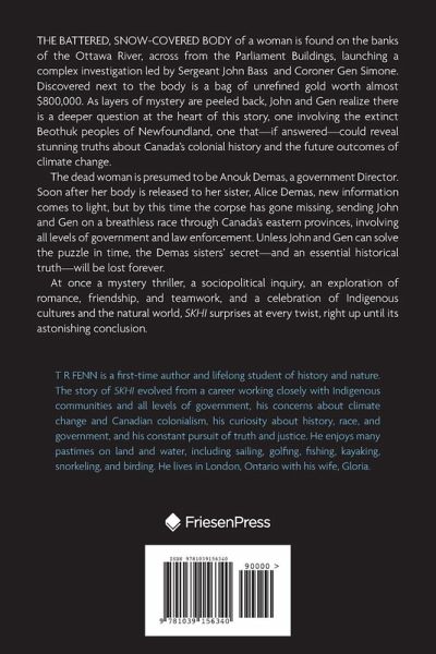 The battered, snow-covered body of a woman is found on the banks of the Ottawa River, across from the Parliament Buildings, launching a complex investigation led by Sergeant John Bass and Coroner Gen Simone. Discovered next to the body is a bag of unrefined gold worth almost $800,000. As layers of mystery are peeled back, John and Gen realize there is a deeper question at the heart of this story, one involving the extinct Beothuk peoples of Newfoundland, one that-if answered-could reveal stunning truths about Canada's colonial history and the future outcomes of climate change. The dead woman is presumed to be Anouk Demas, a government Director. Soon after her body is released to her sister, Alice Demas, new information comes to light, but by this time the corpse has gone missing, sending John and Gen on a breathless race through Canada's eastern provinces, involving all levels of government and law enforcement. Unless John and Gen can solve the puzzle in time, the Demas sisters' secret-and an essential historical truth-will be lost forever. At once a mystery thriller, a sociopolitical inquiry, an exploration of romance, friendship, and teamwork, and a celebration of Indigenous cultures and the natural world, SKHI surprises at every twist, right up until its astonishing conclusion.