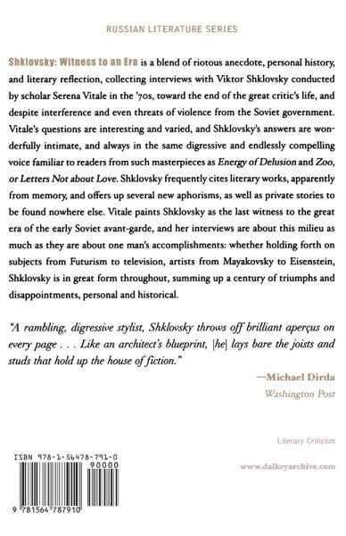 "Shklovsky: Witness to an Era" is a blend of riotous anecdote, personal history, and literary reflection, collecting interviews with Viktor Shklovsky conducted by scholar Serena Vitale in the '70s, toward the end of the great critic's life, and in the face of interference and even veiled threats of violence from the Soviet government. Shklovsky's answers are wonderfully intimate, focusing particularly on the years of the early Soviet avant-garde, and his relationships with such figures as Eisenstein and Mayakovsky. Bearing witness to a vanished age whose promise ended in despair, Shklovsky is in great form throughout, summing up a century of triumphs and disappointments, personal and historical.