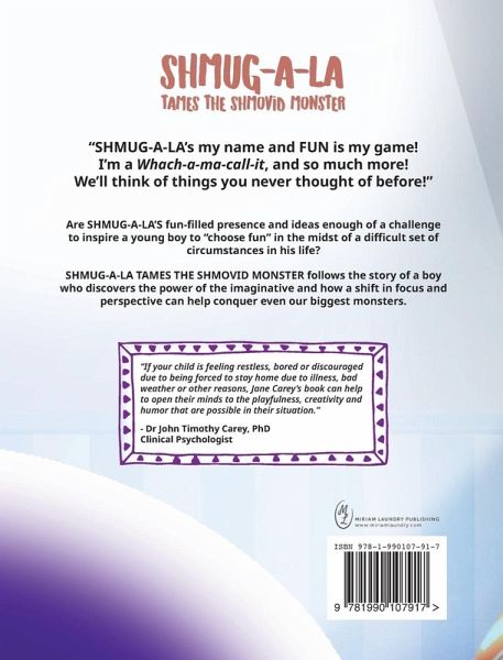 "SHMUG-A-LA's my name and FUN is my game! I'm a Whach-a-ma-call-it, and so much more! We'll think of things you never thought of before!" Are SHMUG-A-LA'S fun-filled presence and ideas enough of a challenge to inspire a young boy to "choose fun" in the midst of a difficult set of circumstances in his life? SHMUG-A-LA TAMES THE SHMOVID MONSTER follows the story of a boy who discovers the power of the imaginative and how a shift in focus and perspective can help conquer even our biggest monsters.